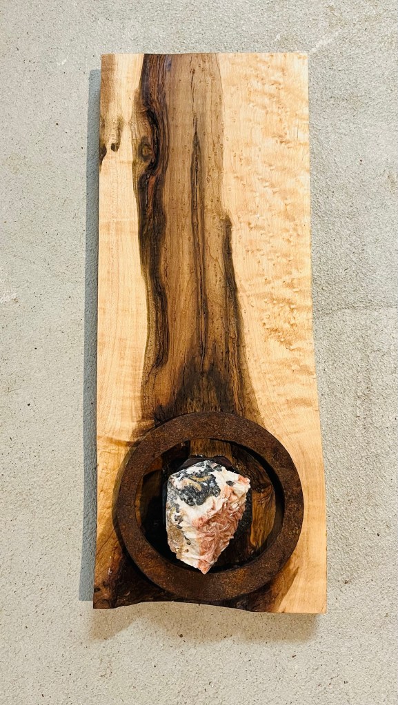 I also create pieces that center on wood, including rare wood: African padauk, katalox, yellowheart, purpleheart, ebony, pink ivory wood, spalted maple. I present the wood as an abstraction, designed, colored and developed by nature. I invite the viewer to see wood outside of the usual utilitarian building material, but instead as a conveyer of the transcendent, something that invokes a spiritual experience of conjoining with the natural world.